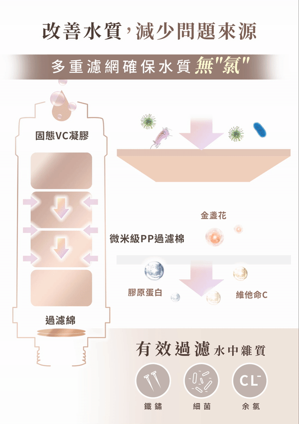 去除餘氯、雜質、鐵鏽,告別粗糙與敏感,讓肌膚接觸到的每滴水都安全又溫和。