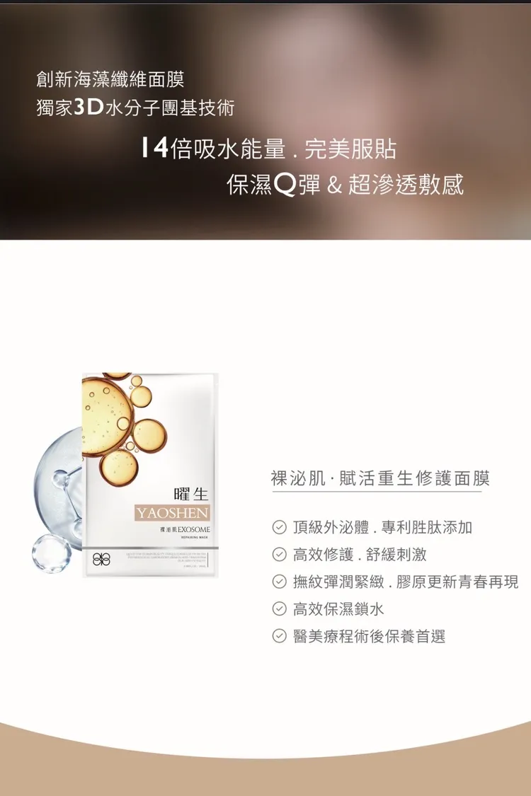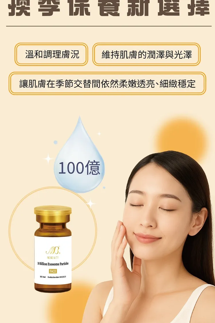 • 功效:外泌體是細胞間傳遞訊息的「智慧修復因子」,能促進皮膚細胞再生、修護受損組織,提升膠原蛋白與彈性蛋白的生成。