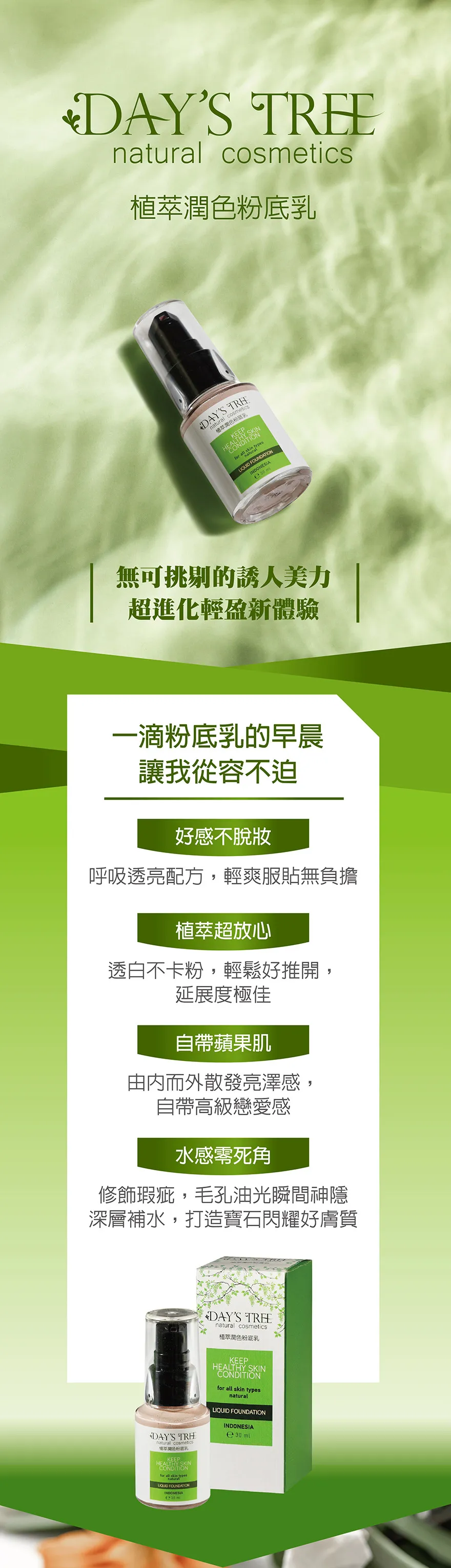 商品規格:30ml 適用所有膚質 用法:日霜後取適量推勻於臉,頸部萃取雨林天然草本根莖葉合成植物潤色成份以物理性的天然防曬具有遮瑕、潤色、保濕、修護提升肌膚保護作用與臉部輪廓立體感打造自然明亮薄透服貼的好氣色零粉感可口奶油肌宛若天生的好膚質
